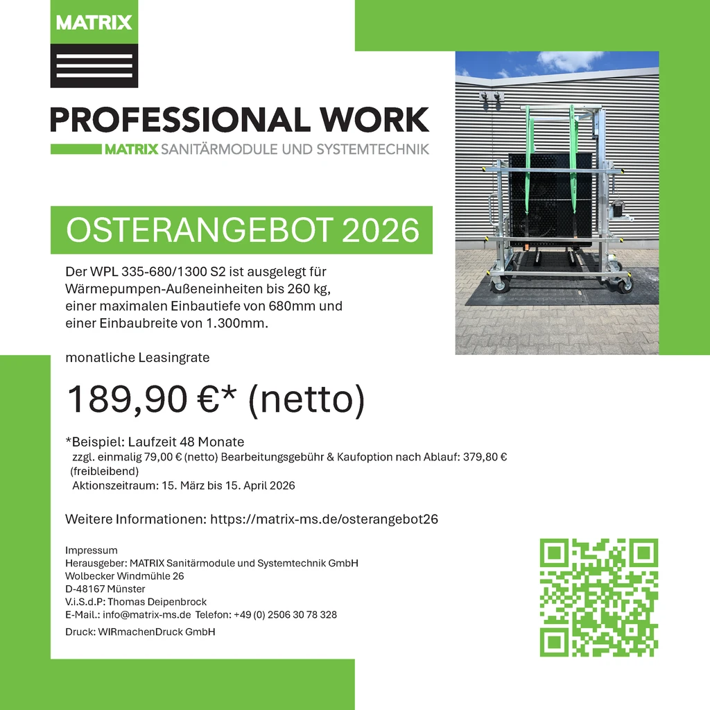 Die robuste Konstruktion vom MATRIX Wärmepumpenlift ermöglicht ein präzises Heben und Senken der Geräte, wodurch körperliche Belastungen deutlich reduziert werden. Gleichzeitig sorgt das stabile Plattformdesign für eine sichere Positionierung der Wärmepumpen während des gesamten Transport- und Montageprozesses.